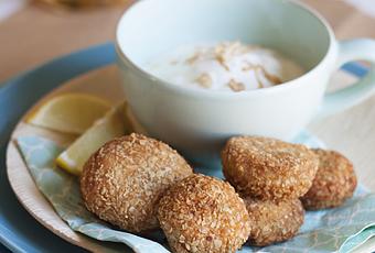 Sacar nuestros aros de cebolla con guacamole del congelador unos 5 minutos antes de empezar a rebozar. Nosotras hemos querido hacer un rebozado crujiente, para ello hemos metido en la trituradora los copos de avena durante unos segundos para que quede más pequeño.