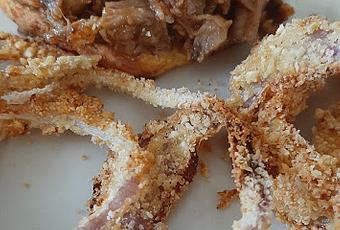 Sumergir los aros de cebolla de uno en uno en la mezcla de huevo y luego en la mezcla de harinas.