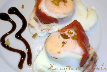 Un pimiento rojo de El Bierzo 4 huevos 8 lonchas de jamón serrano 4 cucharadas soperas de pisto Cebolla frita Sal