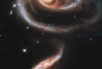 Arp 273 es como se denomina a un grupo de dos galaxias espirales – UGC 1810 y UGC 1813 – situadas a una distancia de 300 millones de años luz en la constelación de Andrómeda. La galaxia mayor, la UGC 1810, tiene el disco deformado por la atracción gravitatoria de su compañera más pequeña situada más abajo en la imagen, la cual tiene en su núcleo claros indicios de una intensa formación estelar quizás provocada por el encuentro con su galaxia compañera.