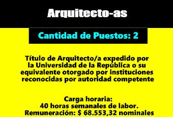 REQUISITOS PARA DESEMPEÑAR EL CARGO 1. EXCLUYENTESA.- Formación básica o académica:• Título de Arquitecto/a expedido por la Universidad de la República o su equivalente otorgado por instituciones reconocidas por autoridad competente.• Curso AutoCADB.- Experiencia:• Un año en el ejercicio de la profesión.