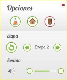 Al pulsar en la rueda dentada de la esquina superior derecha, nos aparecerán estas opciones: Volver al inicio (botella), Volver al menú (casa), Salir del Juego (puerta), Ir a la siguiente etapa y Subir o bajar el volumen del juego.