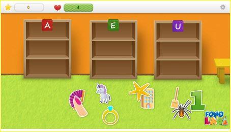 "Arrastra las vocales" es un juego en el que hay que arrastrar las imágenes hasta las vocales con las que comienza su nombre y que pertenece a la Web Fonolab cuyo objetivo es la creación de juegos fonoaudiológicos para niños que pretende estimular el desarrollo de los distintos niveles del lenguaje en niños.