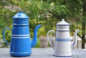 En la cafetera azul brillante, se han utilizado unos guisantes de olor blancos, combinados con unos guisantes azul celeste que tienen un maravilloso olor a lavanda. Se ha buscado una combinación de cinco tallos, a distintas alturas, para que entre todos el conjunto quedara armonioso. Dentro del filtro de la cafetera, se ha hecho una combinación de guisantes de olor y unos no me olvides.