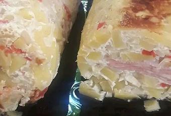Primero picas las papas ..después fritas cebolla ajo perejil cebolla verde sal pimienta ají molido, una ves que esté medio cosido se lo agregas a las papas picadas qué están sin cocinar .le agregas 6 huevos al relleno agrale vastante aceite y mechas todo llenas la caja con el relleno si quieres le pones algún fiambre al medio..lo cocinas al horno 50 minutos y listo