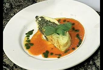 - En el fondo de un plato sirva una porción de coulis, en el centro una porción de soufflé, acompañe con aceite de albahaca. Decore con hojas de albahaca fresca.