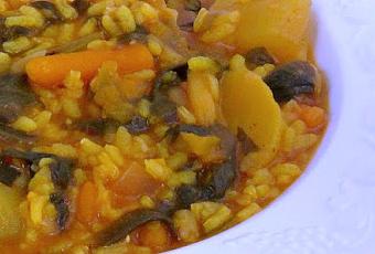 Arroz con acelgas, plato típico valenciano.- En una cacerola con un chorrito de aceite, pochar 1 cebolleta y 2 dientes de ajo, todo picado. Añadir 1 cdta, de ñora molida y 2 tomates pelados y picados. Añadir 150 grs. de acelgas lavadas y picadas, 2 patatas peladas y chascadas, 2 zanahorias troceadas y 1 nabo pelado y troceado. Cubrir con agua y probar de sal.