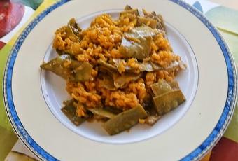 Este domingo para comer Julio ha hecho un delicioso plato de arroz a la cazuela con tirabeques. Le da un sabor espectacular. En casa aunque somos dos siempre hace más arroz de la cuenta pues le gusta mucho y no le importa comer a todas horas