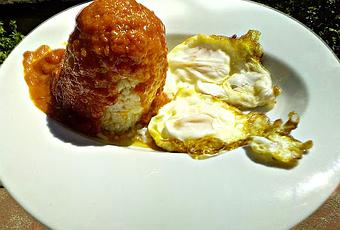 Calentamos el tomate que vayamos a usar durante 7 minutos, y montamos el plato. Yo utilizo un plato de porcelana Porvasal , ponemos el arroz con ayuda de un vaso para formar una montaña y a cada lado añadimos el huevo y el plátano y solo cuando vayamos a servir le pondremos el tomate a nuestro gusto.