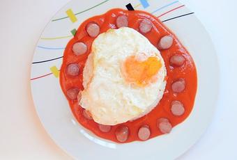 - Servimos en cada plato una taza de arroz, el huevo, el tomate y trocitos de frankurt para decorar el plato.