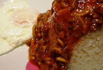 Para componer el plato llenar un bol con el arroz apretando con una cuchara y volcarlo sobre el plato a modo de montañita. Verter salsa de tomate por encima y acompañar del huevo frito.