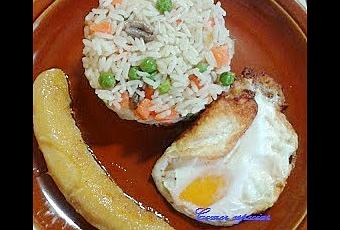 INGREDIENTES: 150 gramos de arroz, 50 gramos de guisantes, 1 zanahoria en cuadrados, 50 gramos de champiñones, 1/2 cebolla bien troceada, 2 plátanos, 2 huevos. 1 poco de aceite, 800 gramos de agua y sal al gusto.