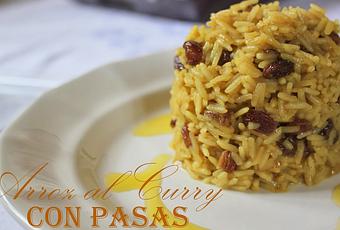 En una sartén grande ponemos el aceite a fuego medio-alto y rehogamos en él las pasas. Cuando empiecen a dorarse e hincharse agregamos el arroz bien escurrido. Removemos durante un minuto para que se mezcle bien con las pasas y se impregne del aceite. Incorporamos las especias ( curry, pimienta y cúrcuma) y mezclamos bien para integrarlas con el arroz. Añadimos la salsa de soja y removemos también para que se impregne el arroz. Será el momento de agregar la mitad del caldo y subir un poco la temperatura del fuego. Removemos de vez en cuando y cuando haya absorbido la mitad del caldo añadimos el resto del mismo, dejamos que vuelva a ebullir y probamos para ver si es necesario rectificar de sal. Cuando el caldo casi se haya consumido completamente será el momento de retirarlo del fuego y servirlo de manera individual, emplatado con ayuda de un aro ( como en la foto) o en un recipiente para servir como acompañamiento pues, va de maravilla con carnes asadas o con un par de huevos fritos.