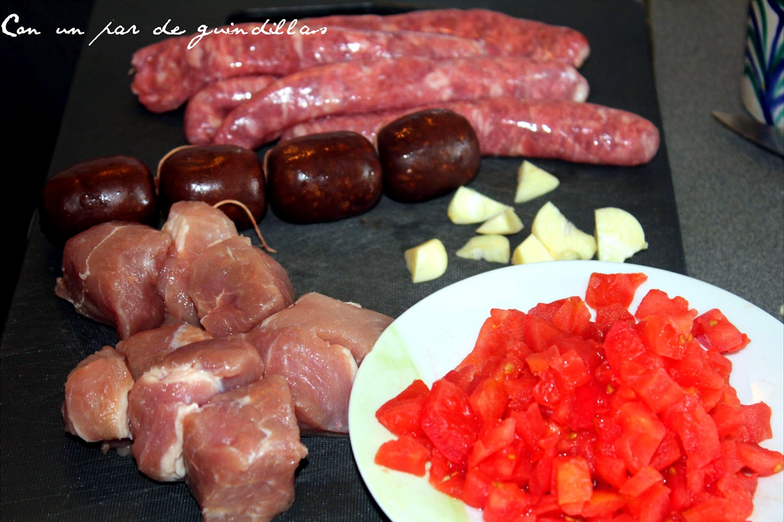 2.- En ese aceite freímos dos dientes de ajo (picados grandes), un tomate (pelado, sin pepitas y cortado en dados), la presa ibérica, la morcilla (partida en cuatro trozos) y las salchichas.