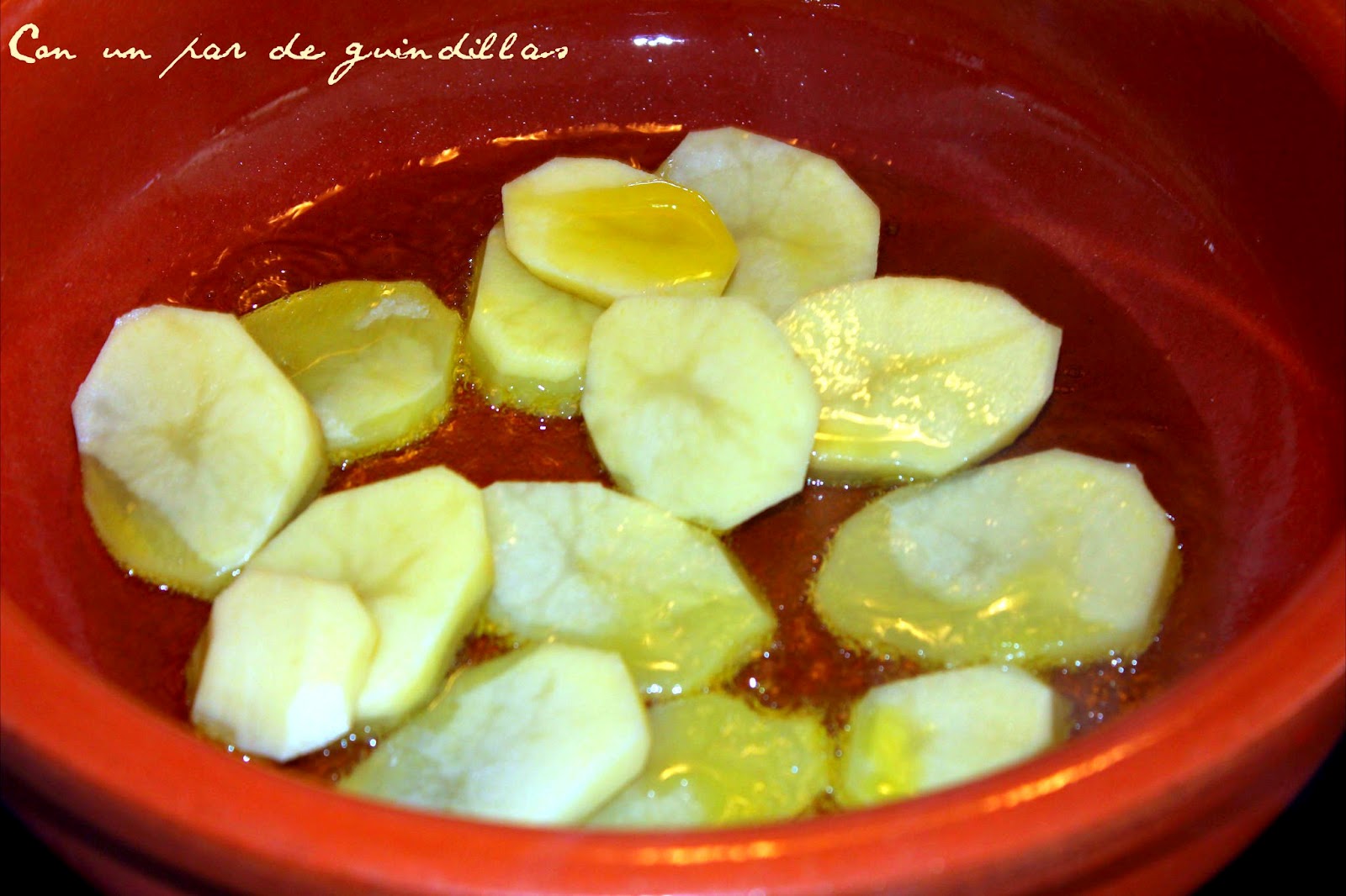 1.- Sofreímos en una cazuela de barro una patata cortada en rodajas (dejarla poco frita). Reservar.