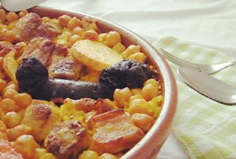 - Agregamos el arroz a una fuente de barro, sobre él añadimos la carne, la morcilla y las patatas bien repartidas, la cabeza de ajos en el centro, un tomate cortado por la mitad a los lados, los garbanzos e incorporamos el fondo bien caliente.