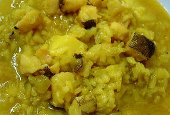 Elaboración:Desalar el bacalao durante dos días cambiándole el agua 3 veces.Cortar y lavar la col bien pequeña y hervir previamente en la olla expres durante 5 minutos. Escurrir y reservar.En una cazuela, sofreir el bacalao cortado pequeño con los ajos pelados y laminados. Añadir la col y las patatas cortadas a cuadros, sofreir durante unos minutos.Añadir el caldo de pescado, dejar hervir unos 5 minutos. Incorporar el arroz, el colorante y sal al gusto.Cocer a fuego medio durante 14 minutos. Dejar reposar durante 4/5 minutos más y servir.