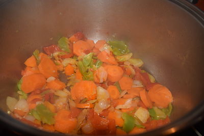 En una cacerola pon a calentar el aceite. Pica la cebolla, pimientos y sofríe.