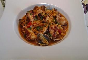Cuando empieza a hervir incorporamos el azafrán y dejamos cocer durante 20 minutos aproximadamente. Sazonamos y cuando falten 5 minutos para terminar la cocción del arroz, añadimos el pulpo troceado, las almejas y las gambas peladas.