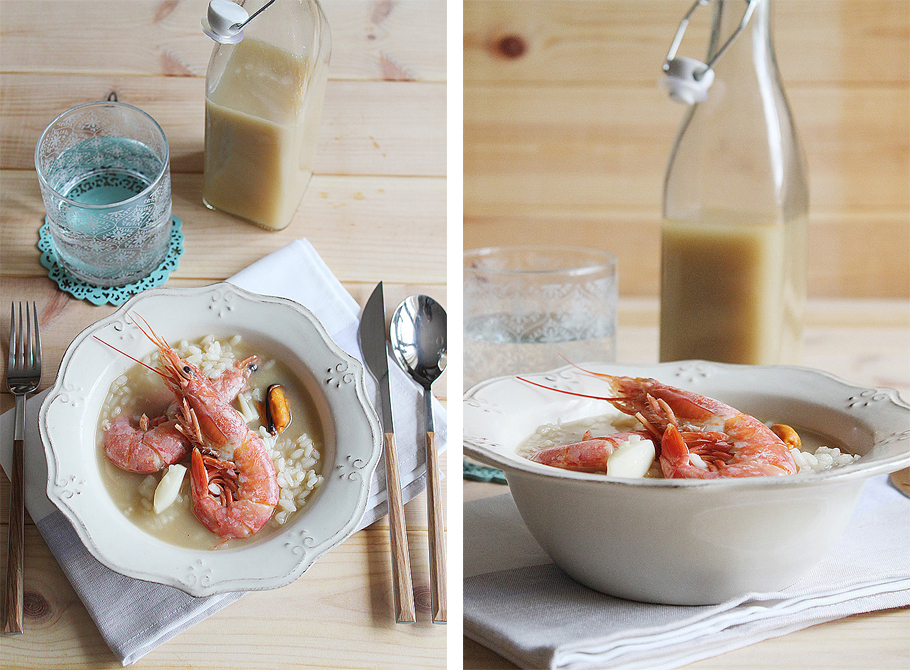 Para esos días que te hacen sacar de nuevo el abrigo después de guardarlo al primer rayo de sol de marzo, esta es una receta que le va como anillo al dedo. Un caldito casero, calentito con unas gambas frescas y un poco de marisco hacen de esta receta una receta diez.En mi familia no hay quien se resista a repetir plato. ¿Vosotros que preferís que el arroz quede blanco o añadirle una pizca de colorante amarillo como el de la paella? A mi me gusta de las dos maneras. Esta vez he preferido dejarlo más natural para dar protagonismo al resto de ingredientes.