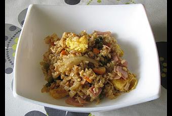 Este arroz es muy parecido al tres delicias pero con salsa de soja, que le da un sabor muy especial.