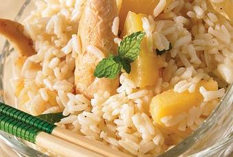 Ingredientes3 tazas de arroz blanco cocido3 cucharadas de jugo de piña2 cucharadas de menta fresca picada1 pechuga de pollo cortada en cubos y cocida4 rebanadas de piña picadas3 cucharadas de aceite de olivaSal y pimienta blanca al gustoPreparación1. Mezcla el arroz con el jugo de piña, la menta, el pollo, sal y pimienta, cubre con plástico autoadherible y deja marinar durante 20 minutos a temperatura ambiente.2. Distribuye el arroz entre las porciones a servir, báñalas con el aceite de oliva y reparte la piña.