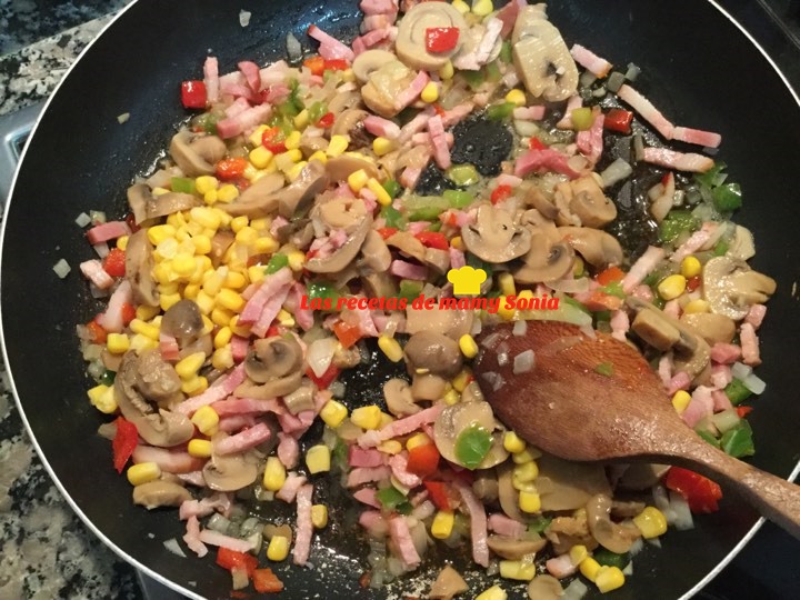 Podemos poner, trocitos de carne( pollo, cerdo), zanahorias, guisantes, jamón cocido, de pavo, gambas, ya sabéis todo es cuestión de gusto.
