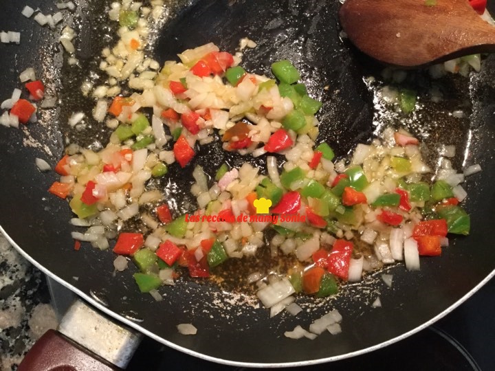 Ponemos en una sartén 5 cucharadas de aceite y sofreímos la cebolla cortadita y los pimientos