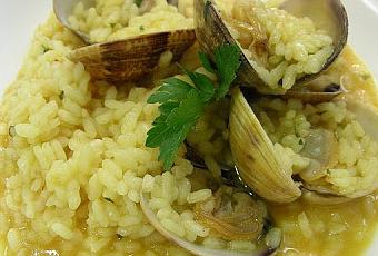 En otro recipiente con agua se cuece el arroz, con un poco de sal, durante 15 minutos. Cuando ya esté blando, lo colamos y lo mezclamos en la cazuela con las almejas. Se sirve muy caliente.