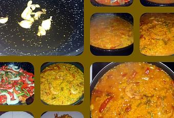 Le añadimos agua caliente el doble que de arroz el azafrán y dejamos cocer, cuando empiece a hervir le incorporamos el arroz y dejamos cocer, comprobamos de sal y le ponemos las gambas, retiramos del fuego y lo dejamos reposar con un paño y listo para servir