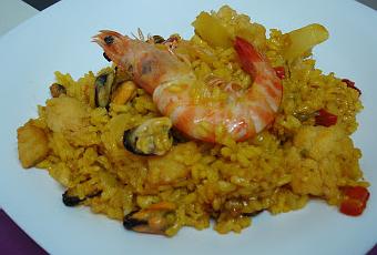 Ingredientes :- 125 ml de aceite de oliva- 4 langostinos- 1 cebolla- 1/2 pimiento rojo- Sal- 3 cortadas de bacalao salado previamente desalado- 1 calamar- un trozo de coliflor- Perejil- 1 cucharada de concentrado de pimiento choricero- 350 grms de arroz- 1,5 litros de caldo de pulpo- 1/2 kg. de mejillones- colorantePreparación :- Poner el caldo a calentar a fuego lento. Limpiar los mejillones, cocerlos, quitarles la concha y reservar.- En aceite de oliva pochar la cebolla y el pimiento cortado pequeño, sal a vuestro gusto. En el mismo momento sofreir los langostinos, sacarlos y reservarlos.- Cuando casi esté pochada la cebolla y el pimiento añadir el calamar y el bacalao cortado. Al cabo de un par de minutos, la coliflor también a trozos, el perejil y el pimentón choricero. Dar unas vueltas y añadir el arroz, sofreirlo a fuego mediano durante unos 3/4 minutos.- Añadir el caldo con el colorante alimentario, probar de sal y cocer durante unos 15 minutos a fuego mediano.- Cuando el arroz lleve cociendo durante unos 5 min. añadir los mejillones y los langostinos.