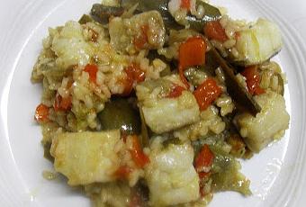 montar el plato con el arroz en la base y cubrir con el bacalao.