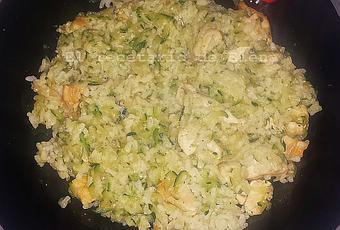 - En una sarten calentamos un poco de aceite y freímos las pechugas. Cuando estén doradas agregamos los calabacines y la cebolla ya rayados, freimos durante 2 o 3 min y acto seguido le agregamos el arroz ya cocido, salteamos todo junto para mezclar bien los sabores.