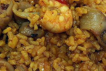 - 1 cazo de arroz por comensal (unos 80 gr.)- 150 gr. de calamares- 10 - 12 langostinos- 1 cebolla- 1 diente de ajo- 1 pimiento verde- 250 ml. de vino blanco- 100 gr. de tomate triturado- 1 lata de pimientos rojos asados- 1 lata de atún al natural- 1 cucharadita de pimentón de la Vera- azafrán o colorante- aceite de oliva- sal- 3 cazos de agua por cada cazo de arroz