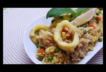Arroz con calamares, ingredientes:300 gr de rodajas de calamares limpios.300 gr de arroz, sal, 1 hoja de laurel.Una hebras de azafrán, 100 gr de guisantes.2 zanahorias, 1 cebolla, 1 diente ajo.100 gr de tacos de pescado.