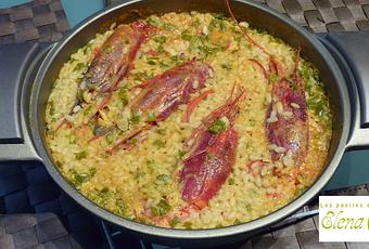 Ponemos en la paellera un chorro de aceite y salteamos los dientes de ajo bien picaditos. Añadimos el pimiento verde también picadito, dejamos cocinar unos minutos y añadimos el tomate rallado dejando al fuego hasta que se evapore el líquido del tomate. Incorporamos el azafrán junto con el arroz, le damos unas vueltas y echamos el caldo, rectificamos de sal, colocamos por encima los carabineros pelados pero con las cabezas. Dejamos cocinar unos 18 minutos.