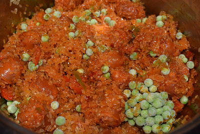 Sofríe durante un par de minutos, siempre cuidando que el pimentón no se queme pues amargaría. Incorpora el arroz y rehoga durante 2 minutos más. Añade los guisantes.