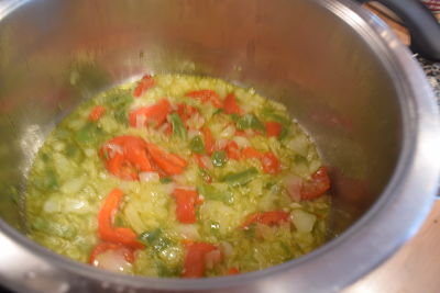 Pon a calentar aceite en el fonde de una cacerola. Sofríe la cebolla y cuando se torne transparente, añade los piminetos picados.