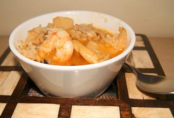 Si podéis conseguir gambas (aquí en Huelva, no hay problemas, jeje) cambiarlas por los langostinos y se pondrían cuando queden 2 minutos (en vez de 4 como los langostinos).