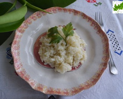 Pon a calentar aceite en el fondo de una cacerola. Fríe los ajos laminados. Corta la coliflor en ramitos y cuece unos minutos en agua hirviendo (no tiene que quedar blanda, más bien al dente). Pasa la coliflor, ya cocida, a la cazuela junto con el arroz y el vino. Rehoga todo junto. Agrega un poco del agua de la cocción de la coliflor y el caldo de ave ( entre los dos, doble del volumen de arroz), pon sal y pimienta al gusto. Sigue cociendo durante 20 minutos a fuego medio-bajo. Retira del fuego, deja reposar 5 minutos y sirve.