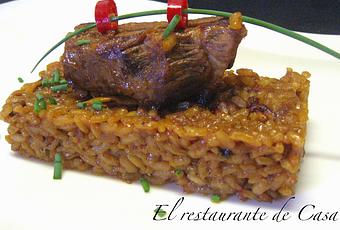 6º " En una paellera colocamos el sofrito le ponemos el arroz unos 100 gr por comensal y le damos fuego, damos unas vueltas al arroz y añadimos la costilla de cerdo, añadimos las setas y el caldo hasta cubrirlo todo. El fuego lo pondremos fuerte y dejaremos que se vaya reduciendo el caldo, si vemos que le falta le podemos añadir hasta transcurridos 10 minutos ya que a partir de este momento lo meteremos en el horno para acabar de hacerlo, 180º 8 minutos y listo, solo nos queda emplatar.