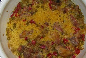 Ingredientes:- 250 gramos de arroz bomba.- 300 gramos de costillas adobadas.- Media cebolla.- 2 dientes de ajo.- 4 pimientos de piquillo.- Media lata de guisantes.- Aceite de oliva virgen extra.- Sal.- Agua.- Colorante. - 1 limón (opcional).