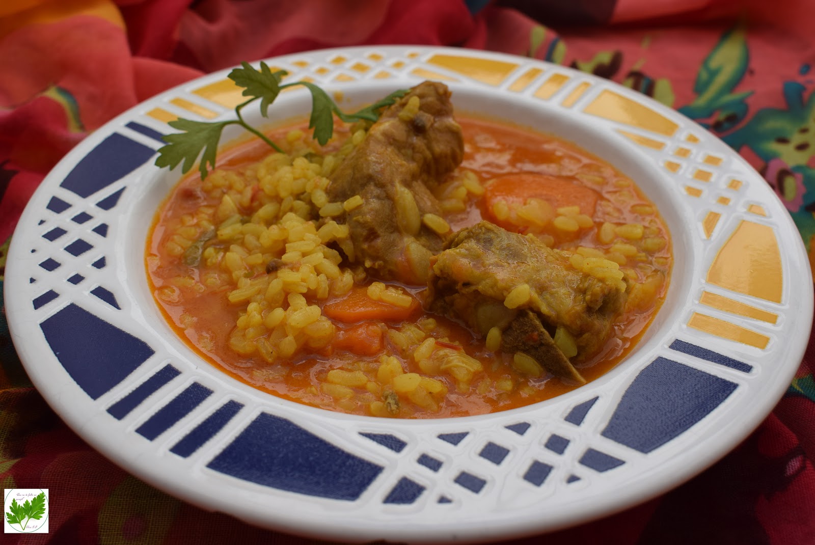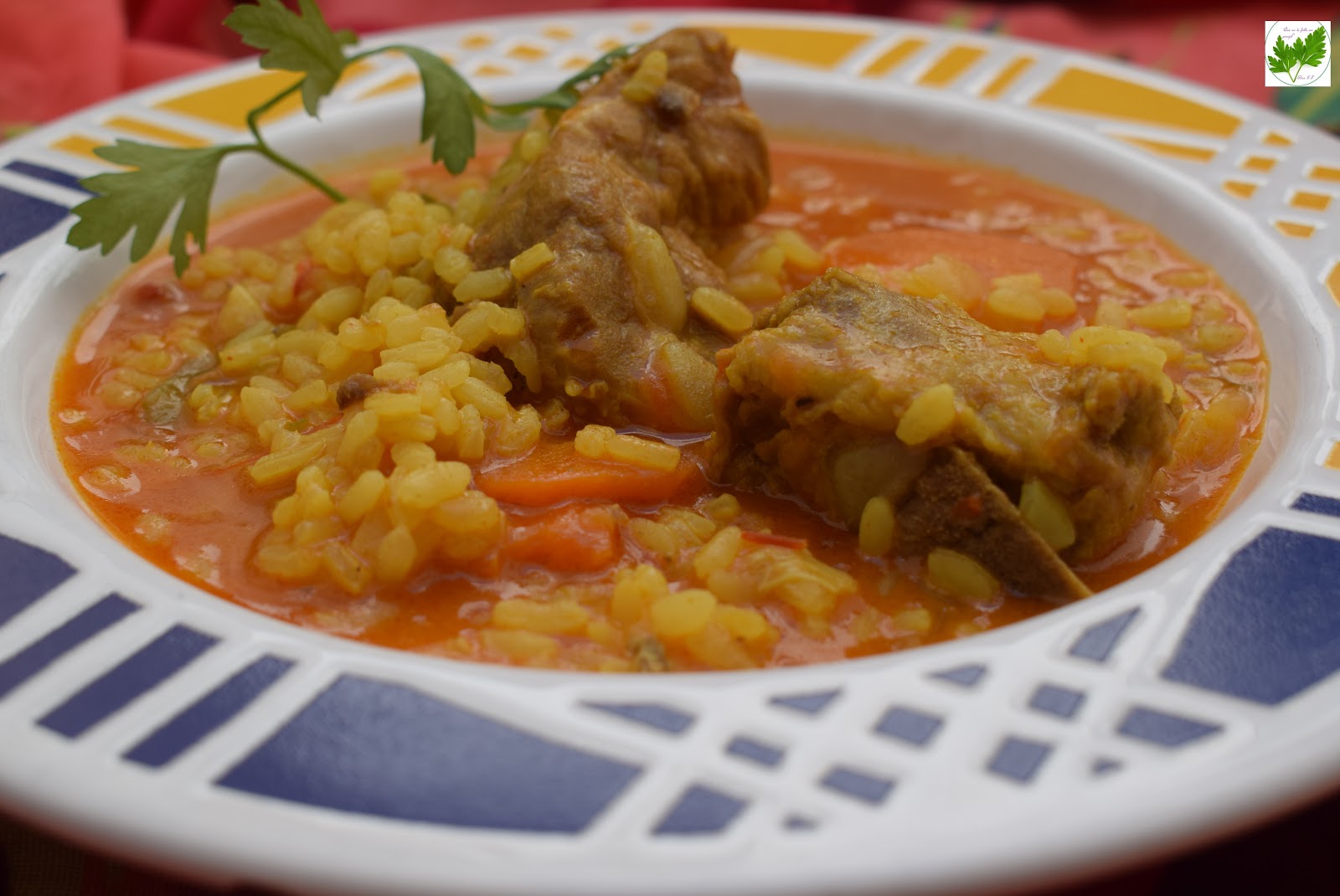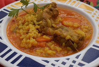 Pon a calentar a ceite en el fondo de una cazuela. Rehoga las costillas. Añade la cebolla y pimiento picados así como la zanahoria cortada en rodajas. Cocina a fuego medio hasta que la cebolla se torne transparente. Añade el vino y espera hasta que evapore el alcohol, unos 5 minutos. Incorpora el tomate rallado y el pimentón, remueve y cocina unos minutos más. Echa el agua y la sal, sigue cociendo a fuego medio durante 15 minutos más.Pon el arroz, rectifica de agua si es necesario, pon cúrcuma y cocina durante 15-20 minutos.
