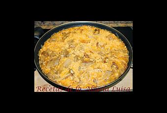- En la misma paellera o sartén amplia que vayamos a usar, freímos las costillas hasta que estén doradas, retiramos y reservamos. - Salteamos ligeramente las setas, retiramos y reservamos. - Entretanto picamos el ajo y la cebolla, lo sofreímos a fuego lento con ½ cucharadita de sal, cuando la cebolla esté bien tierna retiramos del fuego y añadimos el pimentón, volvemos a poner al fuego, incorporamos las costillas y el arroz, le damos vueltas un par de minutos. - Agregamos el vino blanco, dejamos que se evapore el alcohol. - Añadimos las setas, sal, 5 vasos de agua lo dejamos cocer unos 15 minutos (tiene que estar un poquito entero), en caso de que necesite un poco más de agua la añadimos caliente poco a poco, vamos rectificando sazón, dejamos reposar 5-10 minutos y listo para servir.