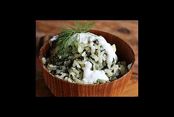 7-Batir los yogures con un tenedor y añadir los ajos picados muy fino, cortar el eneldo y echarlo en la salsa.