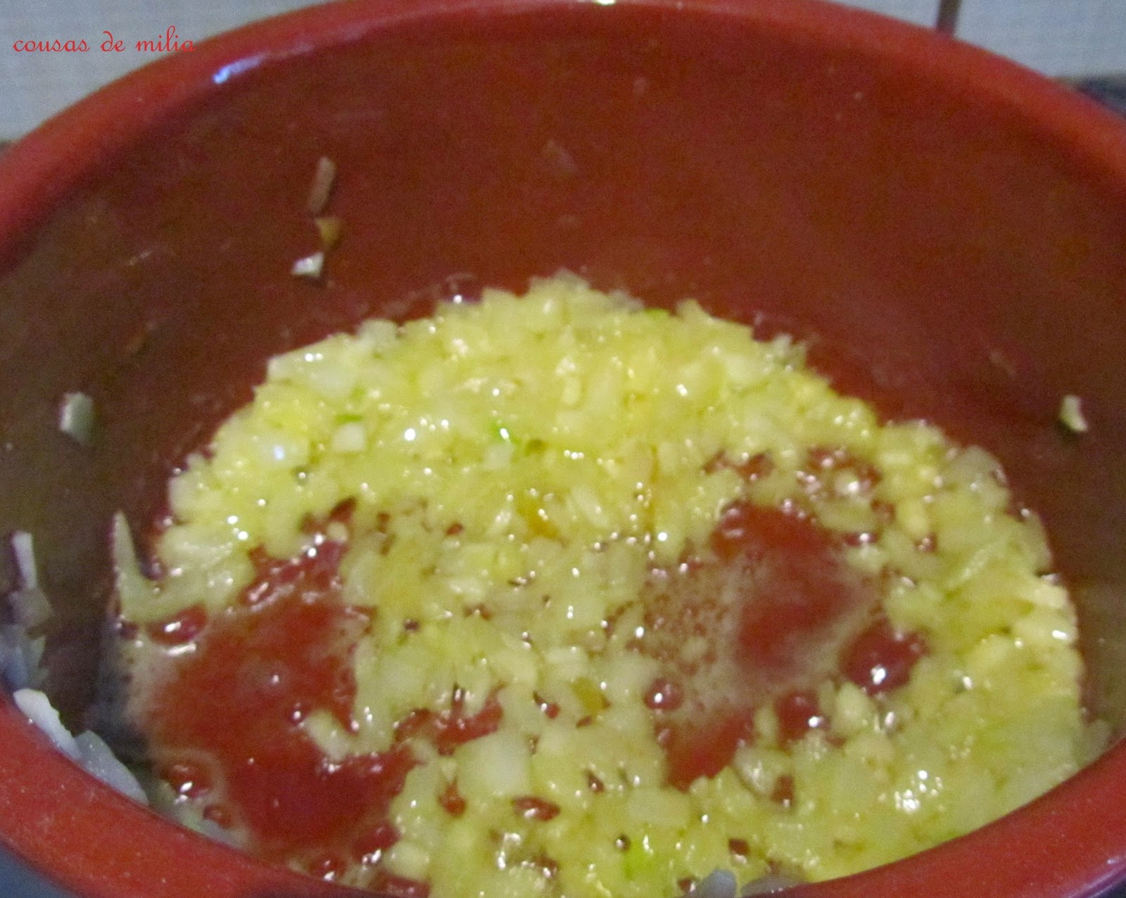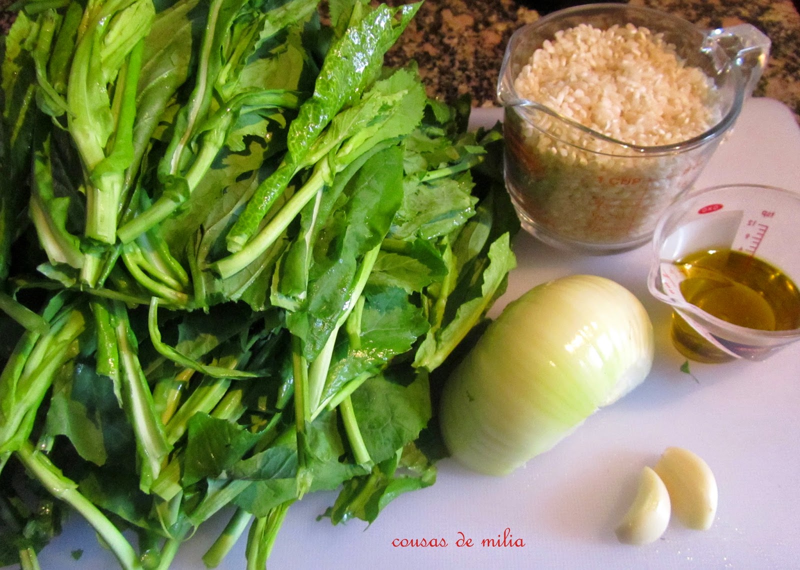 En una cazuela (yo usé una de barro portugesa) se sofríen la cebolla y el ajo picaditos con una pizca de sal, Cuando la cebolla este pochada, se añade el arroz que dejamos sofreír ligeramente, hasta que todos los granos estén transparentes. Añadimos agua caliente, doble cantidad que de arroz, (conviene tener un poco más caliente por si fuera necesario) se deja hervir 5 minutos a fuego fuerte, se baja el fuego y se deja cocer 8-10 minutos (yo lo dejo 8, nos gusta al dente). Trancurridos 13-15 minutos agregamos los grelos, si son muy largos se cortan con una tijera, se mezclan suavemente con el arroz, se salpimenta y se dejan hacer 4-5 minutos más. Se dejan reposar un par de minutos y se sirven.