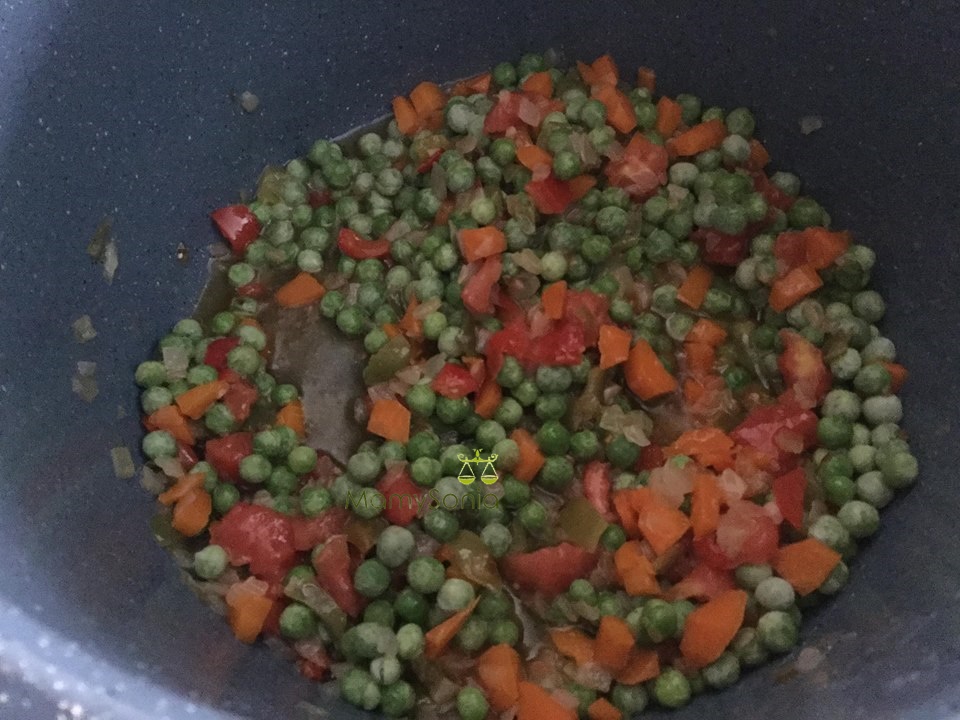 Cuando este bien pochado todo incorporamos los guisantes, la zanahoria y los higaditos, refreímos un poco.