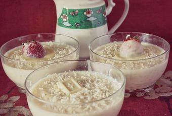 Servimos en copas decorado con chocolate blanco o fresas bañadas en chocolate.