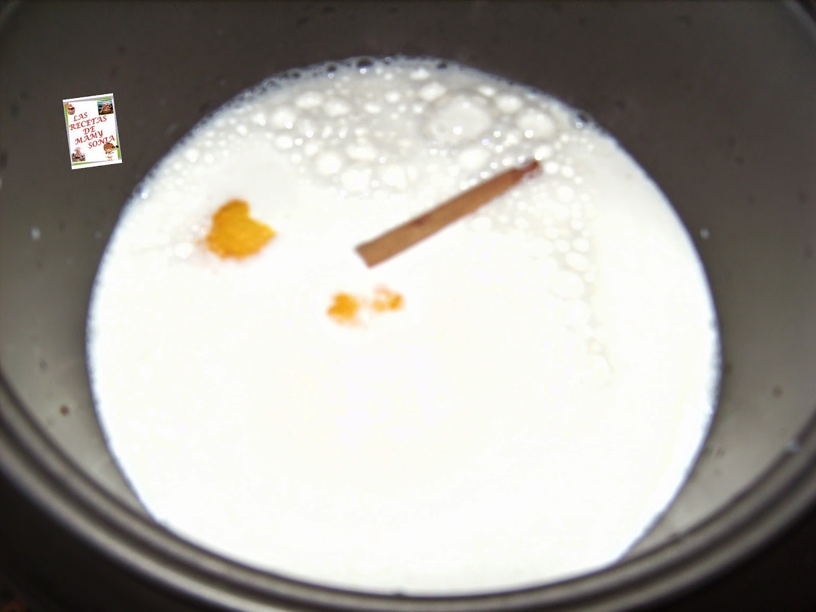 Ponemos en la cubeta el litro de leche, la rama de canela y la corteza de limón y el arroz