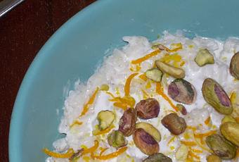 4. Servir el arroz con leche en cuencos o bowls y decorarlo con los pistachos y la piel de los cítricos.